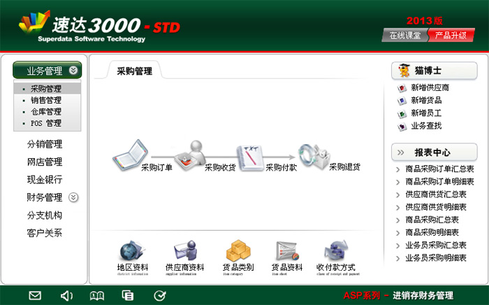 《速达3000G-STD》集进销存、POS、财务、CRM为一体的中小企业管理软件系统。系统采用导航式界面,易学易用、功能强大,是帮助中小企业规范经营管理、财务管理的有效工具。系统支持局域网/互联网多用户应用,实现异地多机构、多店面、多仓库等远程应用,支持Android移动终端应用,数据实时同步,安全、稳定、高效、易维护,特别适合中小企业使用。