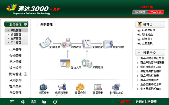 《速达3000G-XP工业版》集进销存、POS、财务、CRM、OA、生产为一体的中小企业管理软件系统。系统采用导航式界面,易学易用、功能强大,是帮助中小企业规范经营管理、财务管理的有效工具。系统支持局域网/互联网多用户应用,实现异地多机构、多店面、多仓库等远程应用,支持Android移动终端应用,数据实时同步,安全、稳定、高效、易维护,特别适合中小企业使用。